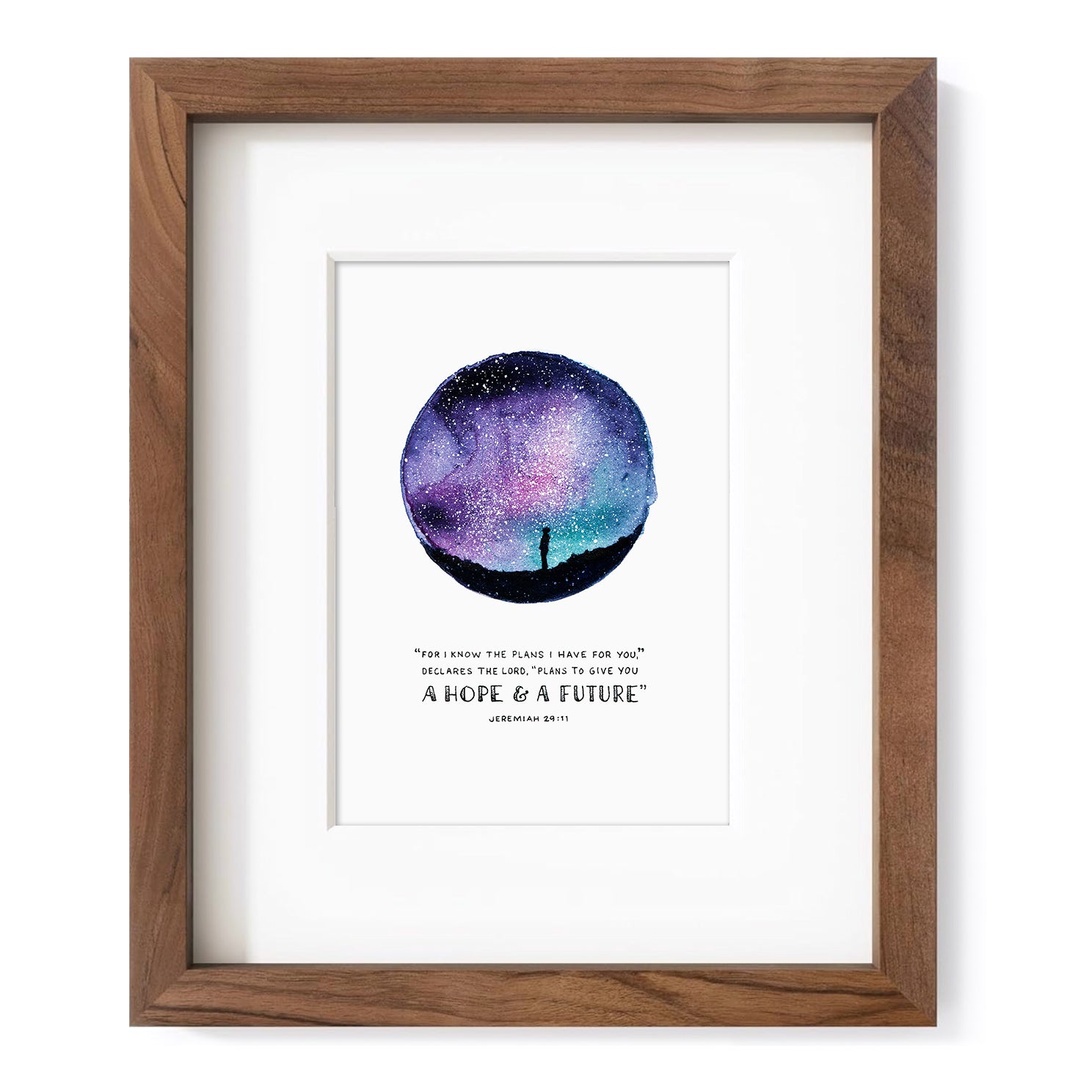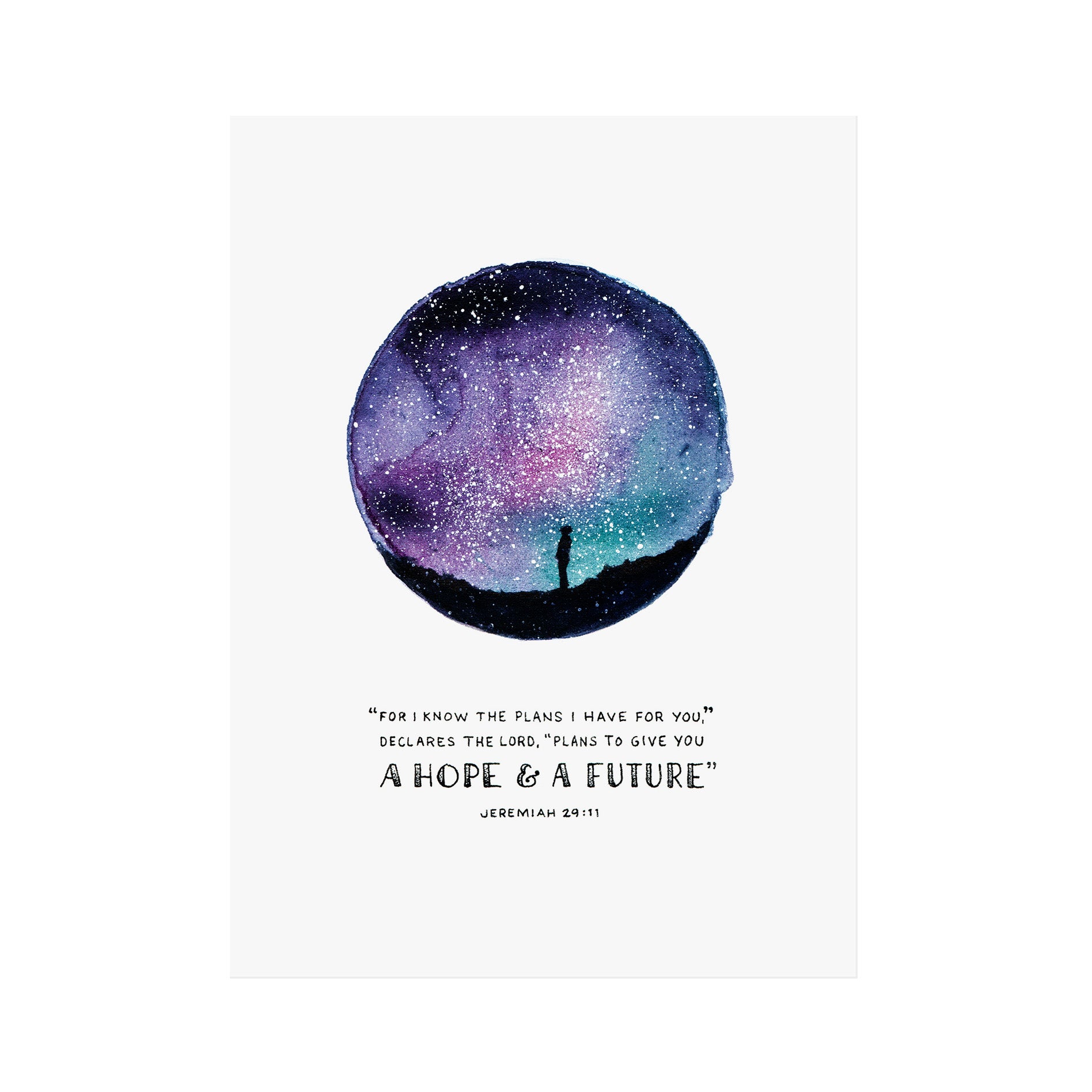 This artwork features a watercolor illustration of somebody gazing into the starry host of heaven. Inspired by the Bible verse in Jeremiah 29:11, it portrays an individual standing below a colorful Milky Way—a simple yet profound reminder of how small we are in God’s vast and beautiful creation.