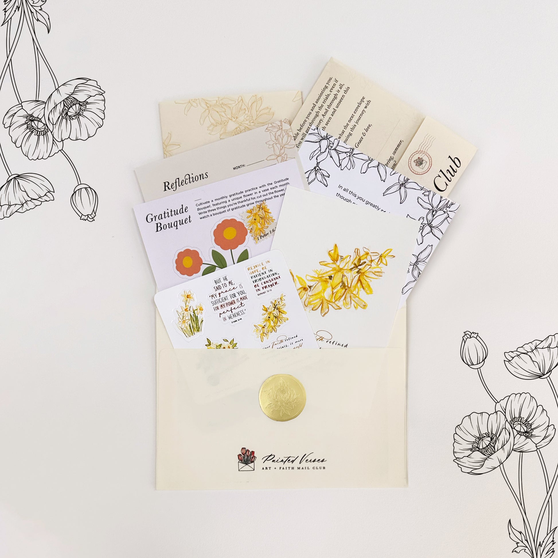 The Painted Verses Art + Faith Mail Club is a monthly Christian snail mail club delivered to your mailbox, thoughtfully created to invite you to slow down and connect with God through art and Scripture. It is designed for anyone longing for a more intentional faith rhythm or a fresh start in their quiet time, especially those who connect through creativity, beauty, and a touch of whimsy.
