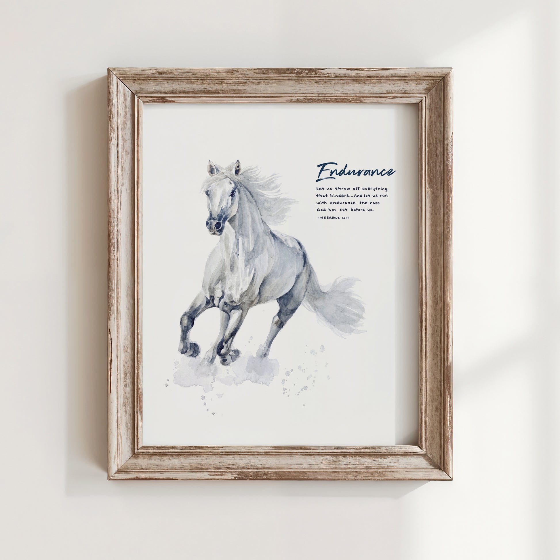 A fine art print featuring a stunning watercolor illustration of a galloping white horse, paired with Hebrews 12:1. This artwork serves as an inspiring reminder for those who may be struggling to press on, encouraging them to run the race God has set before them.