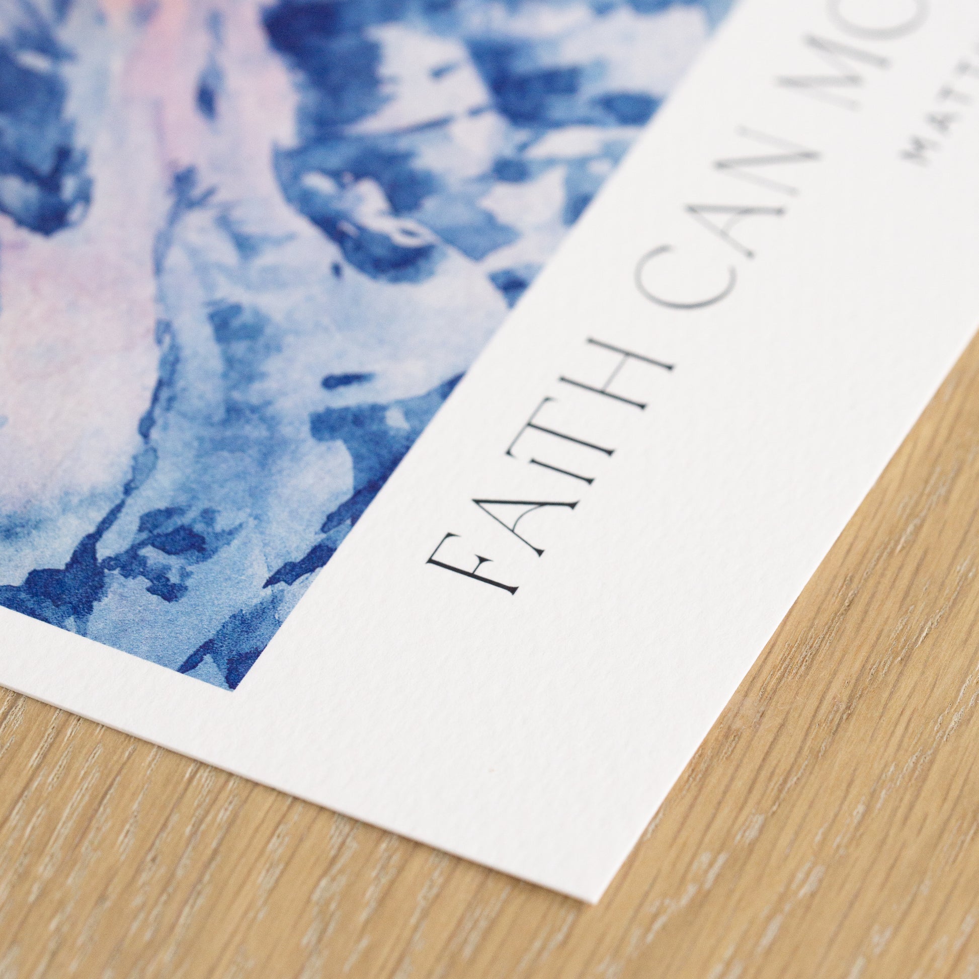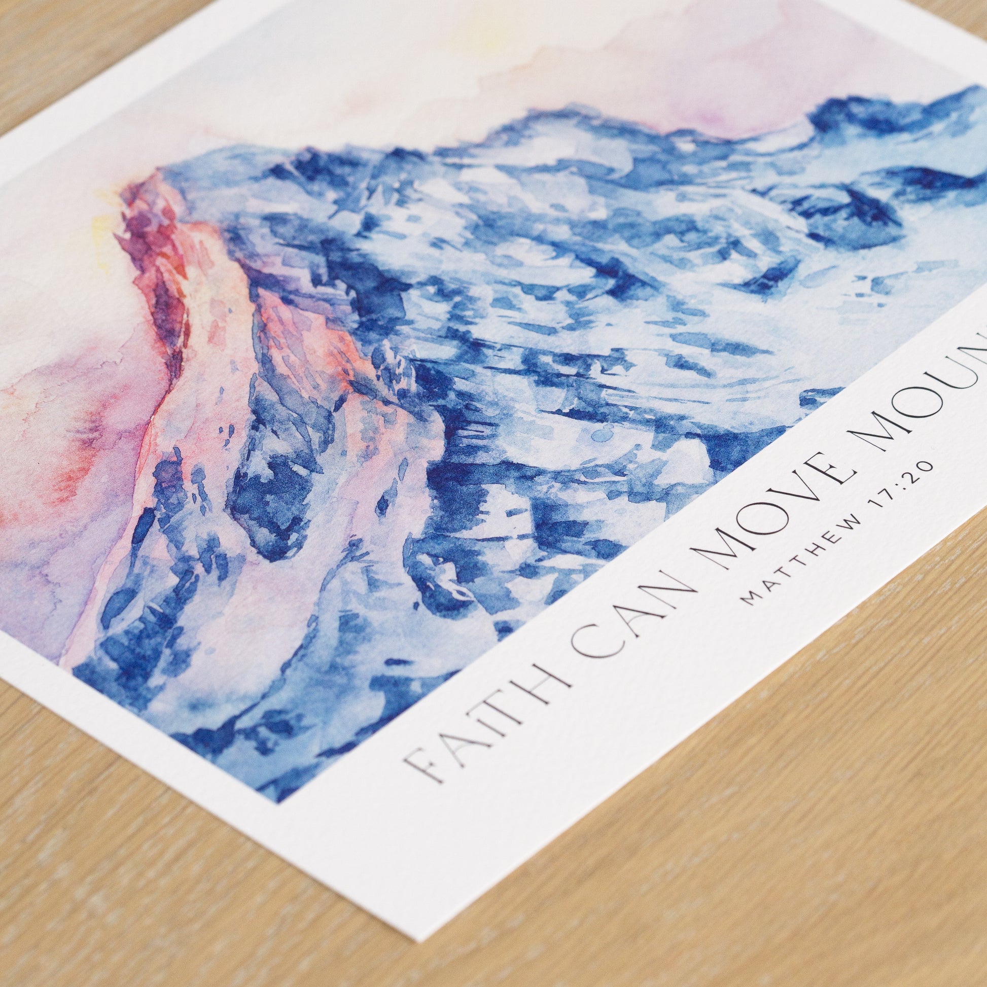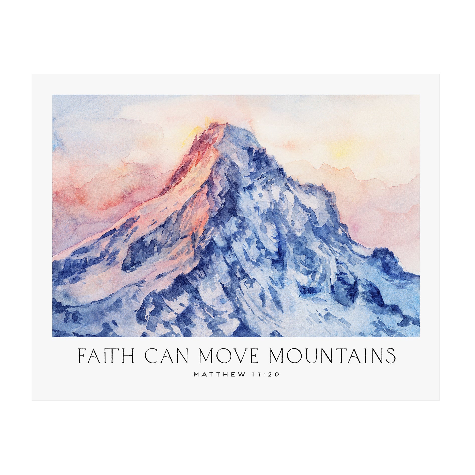 Inspired by the words of Jesus in Matthew 17:20 — “Faith can move mountains” — this piece features a mountain landscape painted in deep blues and golden hues. The colors reflect both the quiet strength of the mountains and the gentle, sunrise hope that faith brings.
