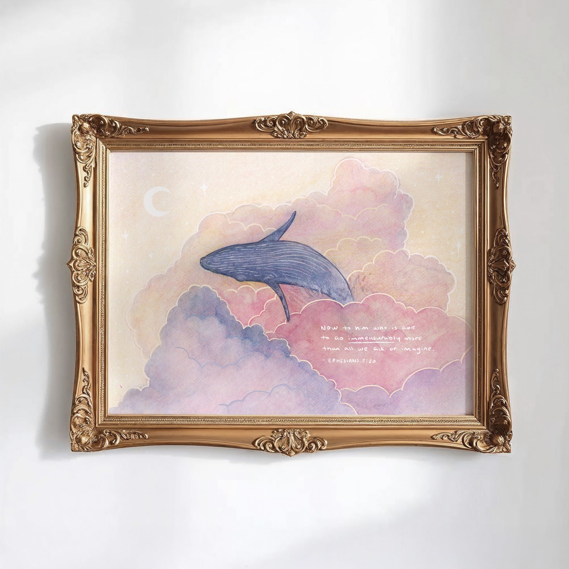 This modern watercolor art print features a whimsical whale emerging from the clouds in the sky, blending imagination and faith in a magical, pastel dreamscape. With soft cotton candy colors and delicate brushstrokes, this creative piece of scripture art brings a sense of wonder and joy to any space.
