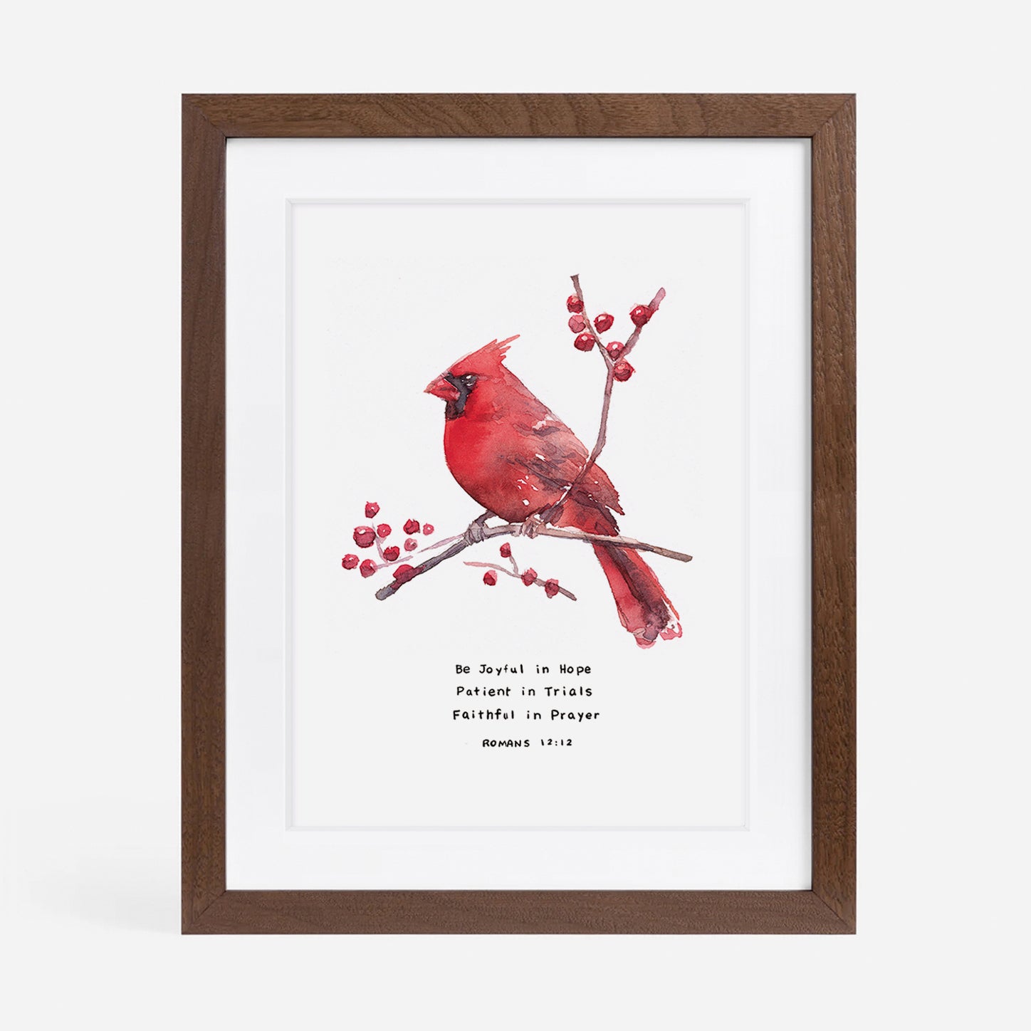 This striking watercolor features a bright red cardinal perched on a branch with winter berries, paired with the verse from Romans 12:12:“Be joyful in hope, patient in trials, faithful in prayer.”