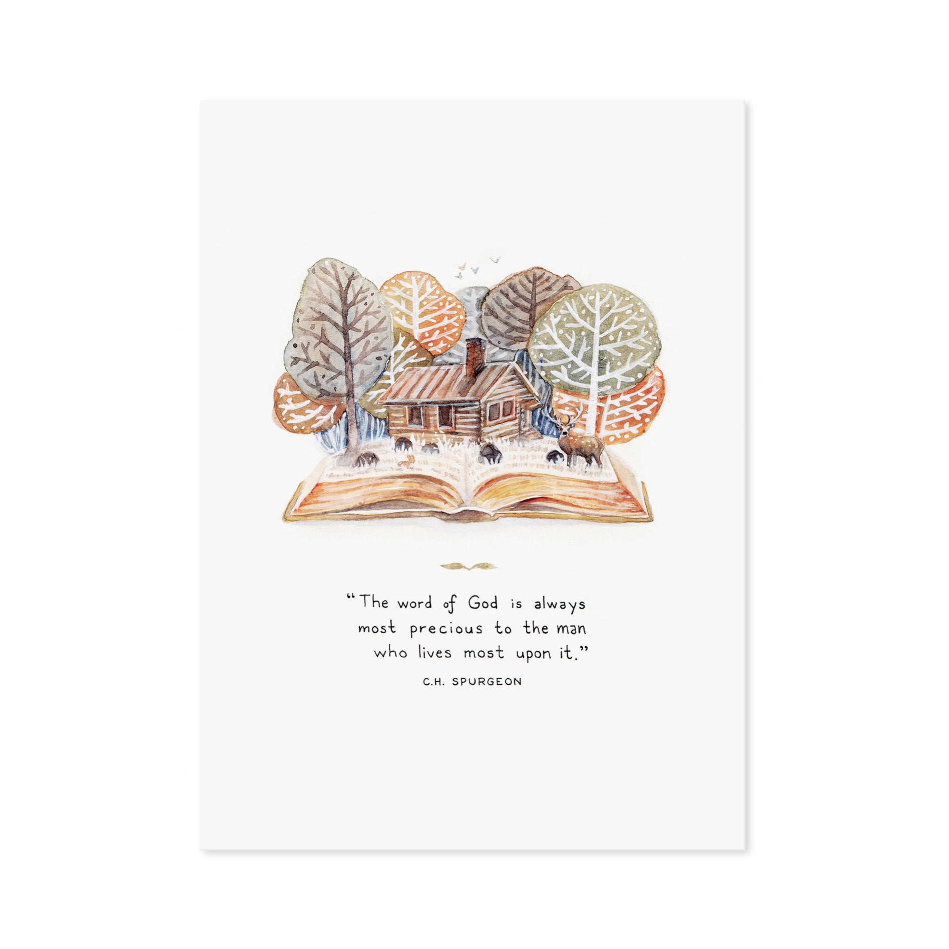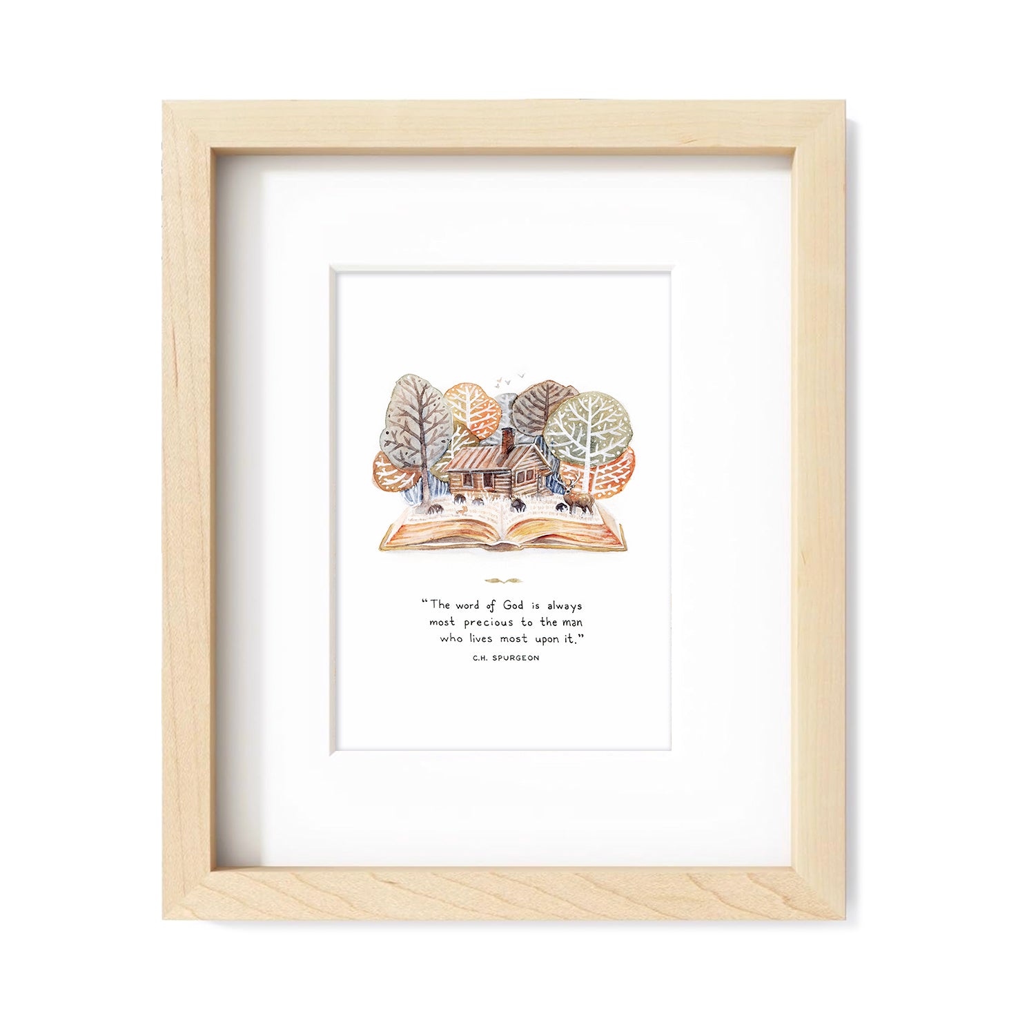 A fine art print based on the wise words of Charles Spurgeon. This artwork features a watercolor illustration of a house built upon God’s Word. Makes a great gift (or personal reminder) for any Christian who cherishes the Bible.