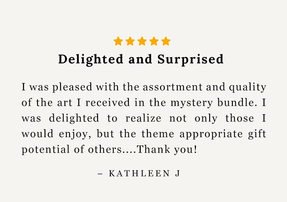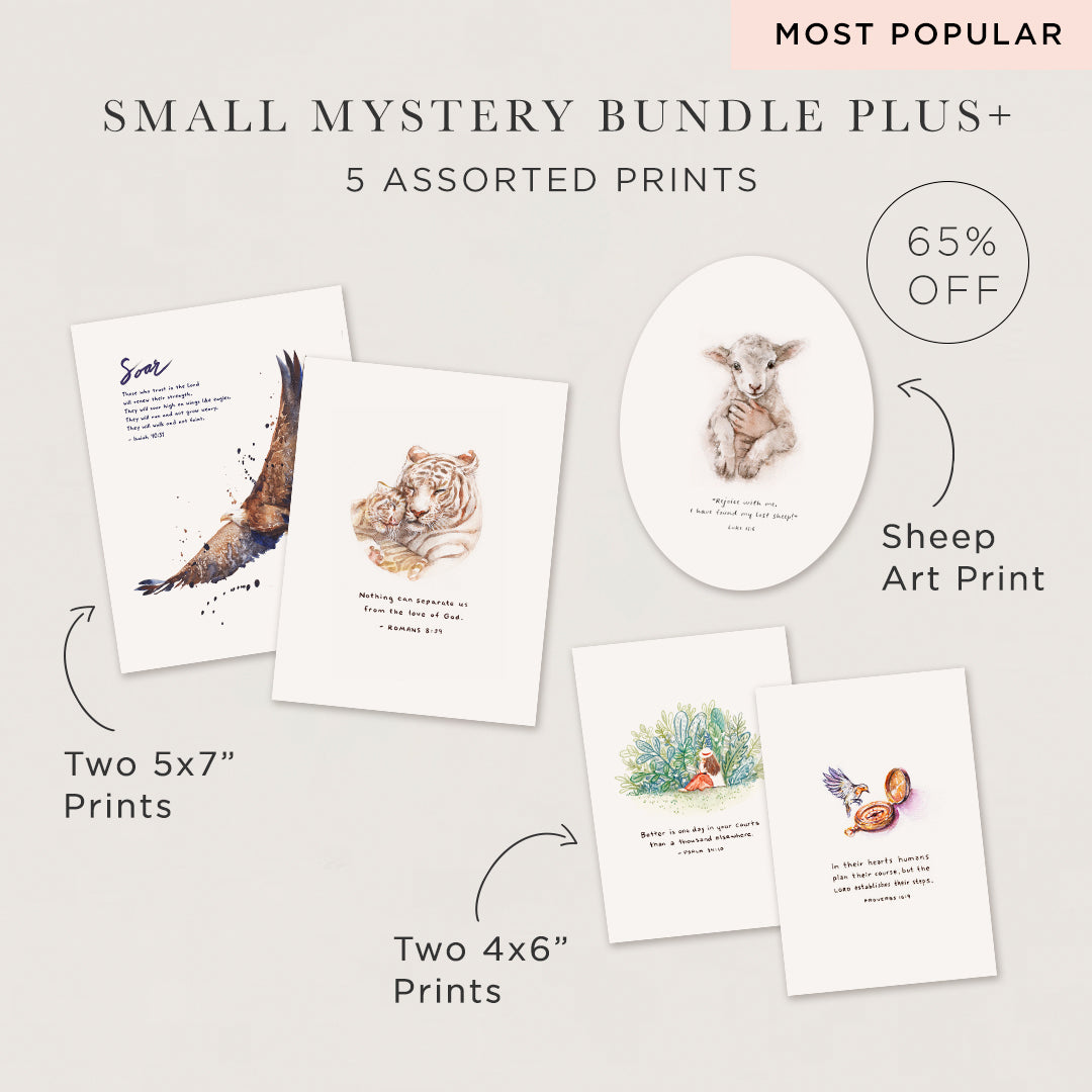 You can expect to receive any art print that we've sold on our website. Each bundle will be a surprise and gives a little extra fun when opening your Painted Verses' mail. Enjoy your Mystery Bundle!