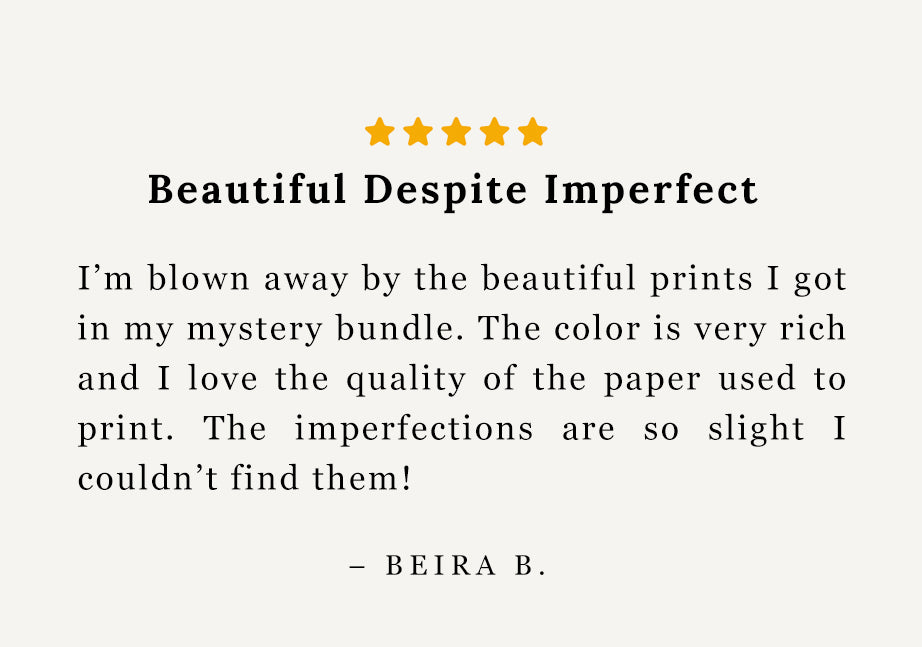 At Painted Verses, we celebrate the hand crafted nature of our art prints. But sometimes a print doesn’t meet our rigorous standards and we set it aside as a ‘studio second’. The imperfections range from a speck on the paper, color variation, paper variation, margin variation, or a crease on the corner. These prints still display beautifully, and the imperfection does not affect the overall integrity of the artwork. It’s an opportunity to “reclaim and redeem” a high quality art print at a fraction of the cost.