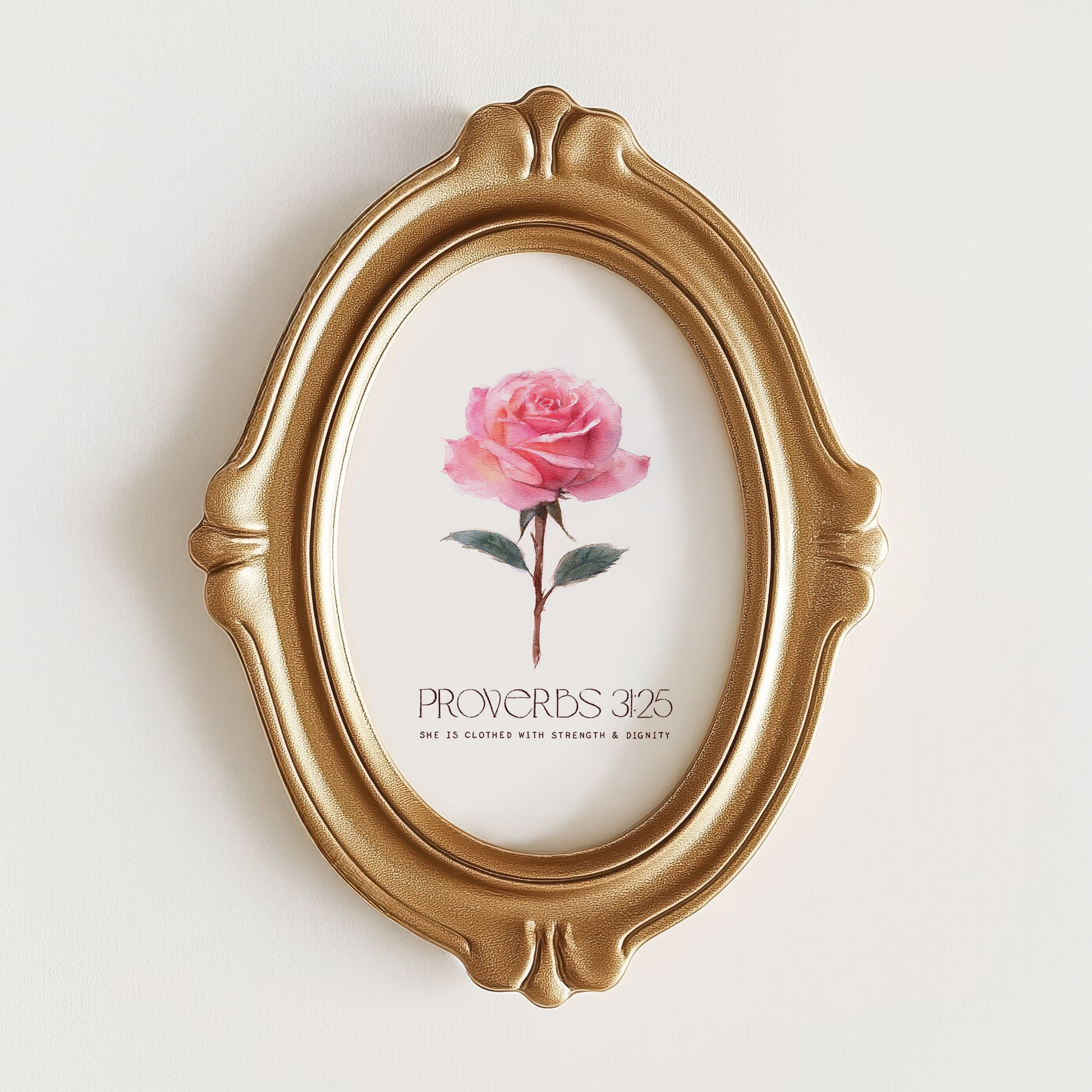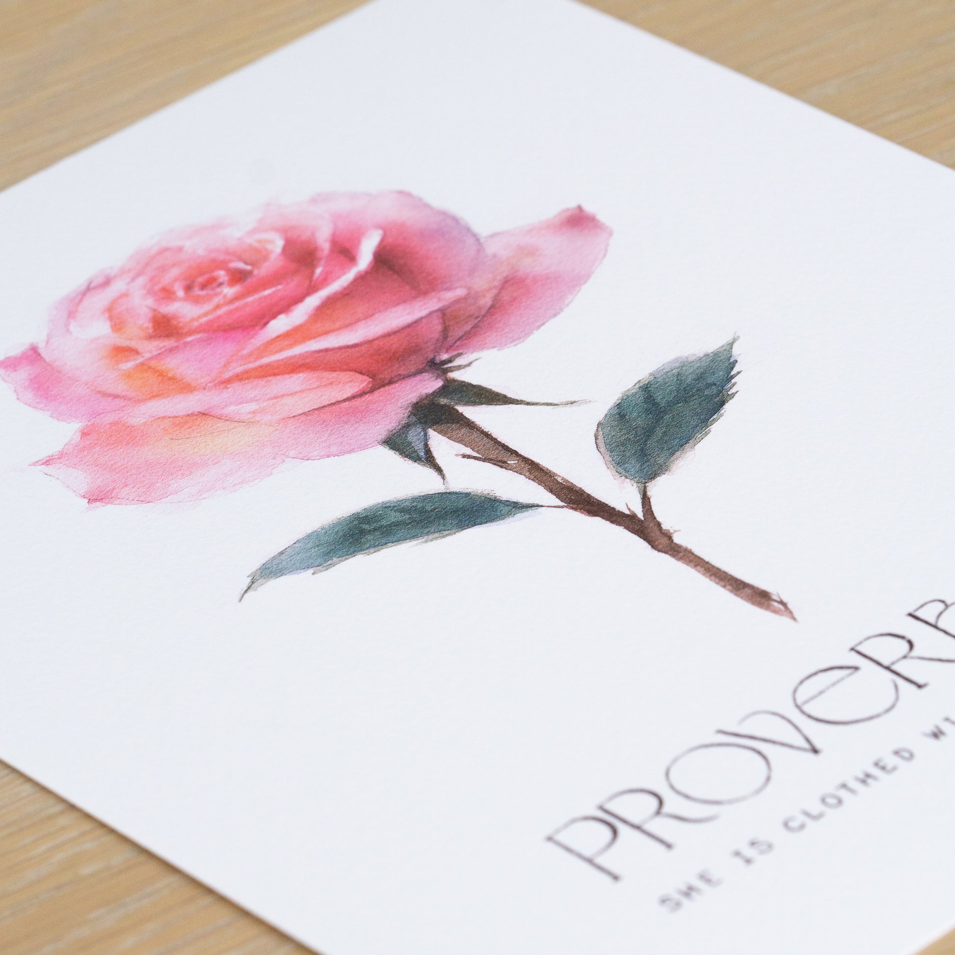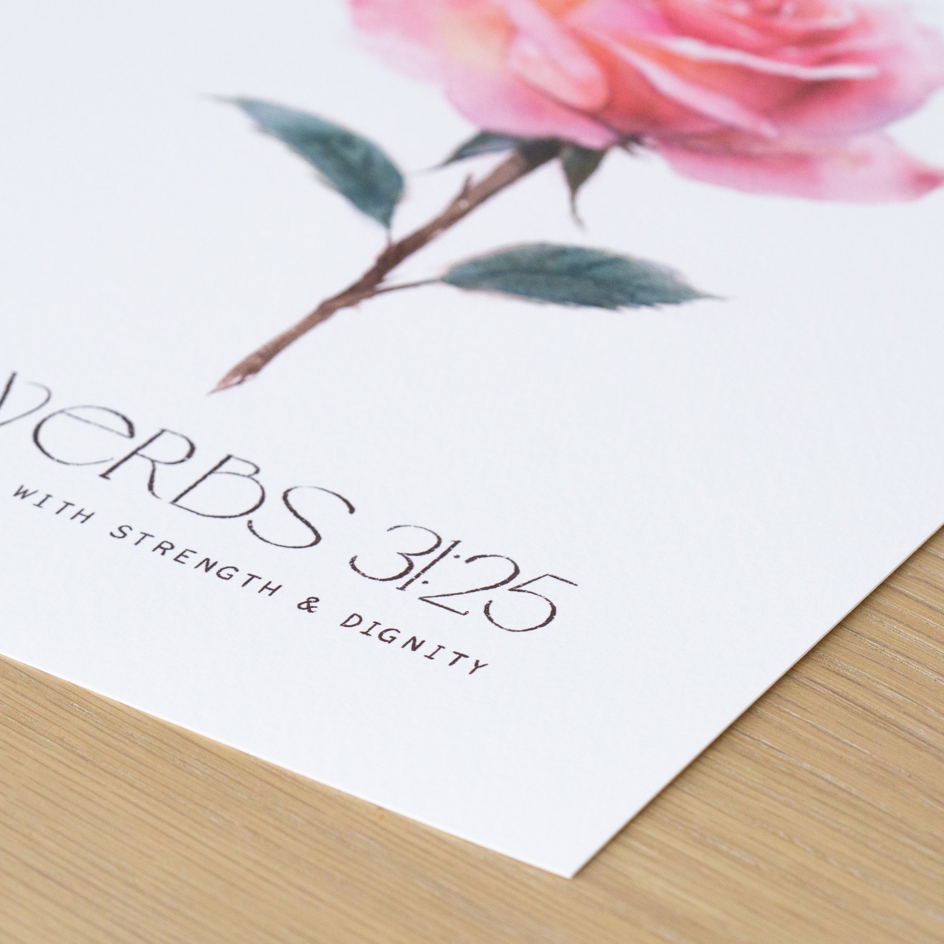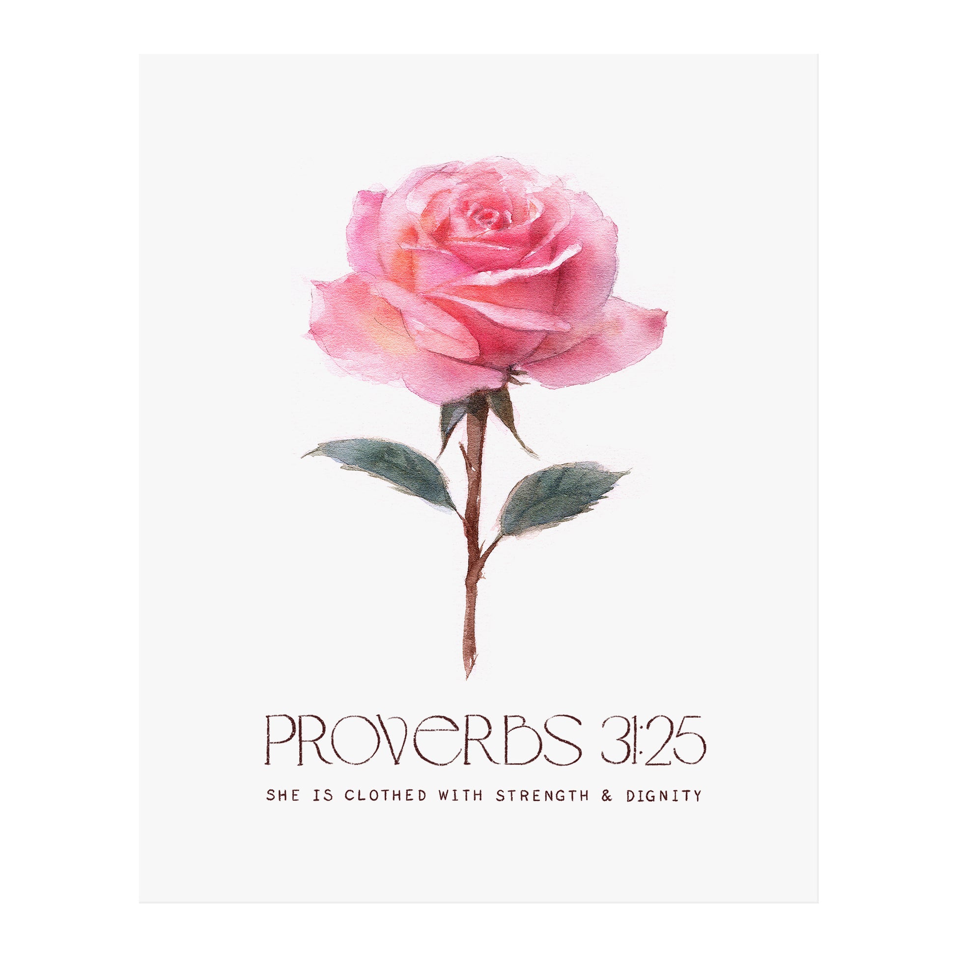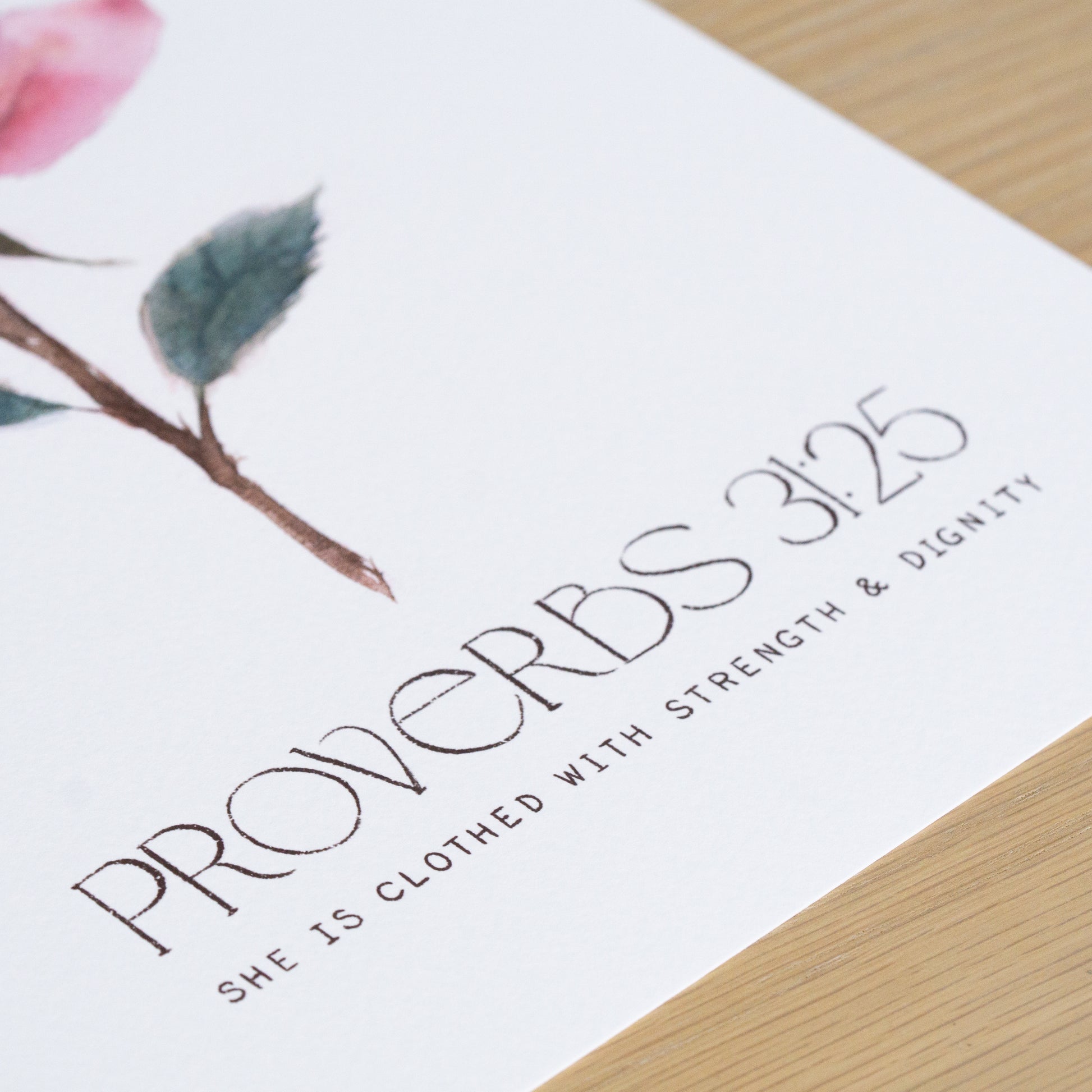 This piece features a beautiful watercolor rose paired with hand-lettered bible verse from Proverbs 31:25–26: “She is clothed with strength and dignity.”